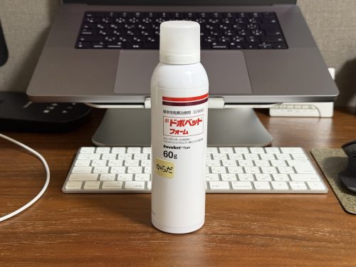 最近、体重増加のせいもあってかより幅広い部位に発症するようになり、先生からこのフォームを勧められました。先生曰く、軟膏よりも効きが良いそうです。最初に提案されたときは軟膏で十分と思って断ったのですが、少し前の通院のときに一回試してみようと思って、フォームを処方してもらいました。