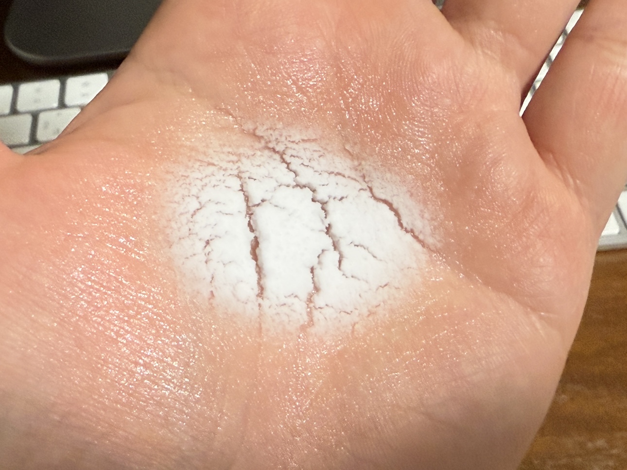 そうすると一旦手のひらにスプレーしてから、それを指ですくい取って塗っていくというスタイルになるわけですが、それはそれで適量が全然分からなくなるんですよね。軟膏の場合は「人差し指の先から第1関節までの量で、指を含む手のひら2枚分(1FTU)」という目安があります。フォームの場合も「2秒間噴射した量で、手のひら2枚分」という目安はありますが、スプレーすると薬剤は山のように積み重なるので指で取る量を調整するのが難しく、軟膏ほどの柔軟性(?)もないので綿棒を使うのも中々難しく(綿棒だと取りにくい、塊で取れてしまう)、なんか塗りすぎてしまう感じがしました。塗る時間、労力も軟膏のときより増した感じです。